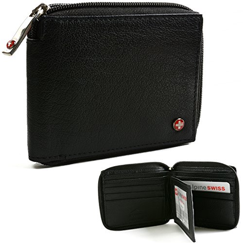 Alpine Swiss Zippered Bifold Men's Wallet with Deluxe Credit Card Flip Genuine Leather -Black NON RFID