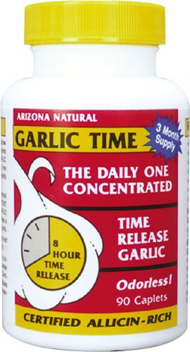 Studio : Arizona Natural Products Publisher : Arizona Natural Products Binding : Health and Beauty Product Description Arizona Natural Garlic Time There is an old adage, " An apple a day keeps the doctor away." But in light of modern research findings, that might be better revised to, " A clove a day keeps the doctor away." The clove, of course is from the lowly garlic bulb, and a daily dose may well keep your visits to the doctor at a minimum. With a medical history spanning thousands of years, garlic's reputation is well known, so the question is no longer whether to take Garlic, but "how" to take garlic. In the past, those desiring the health benefits of garlic merely cracked a clove from a bulb and ate it raw, giving notice to the world that you were healthy, if not socially desirable. These days you can get your garlic in a tablet or capsule with the promise of little or no garlic after odor. While many of the available supplements are very similar to garlic, retaining the valuable sulfur compounds and the allicin, many are not. Steam distilled oils can lose much of their efficacy, and aged garlic extracts are allicin-free. Then there's the question of potency. Just how many capsules or tablets must we take a day to equal the magical amount of garlic in one whole clove? Some brands instruct us to take their tablets three times each day to get the recommended dosage, and with others, no amount will provide the allicin system inherent to raw garlic. All of those factors can create quite a dilemma; unless you're taking Garlic Time from Arizona Natural Products. Garlic Time is the original One-A-Day, time released garlic supplement. Arizona Natural has applied over two decades of garlic expertise to bring you a simple to understand, simple to take odorless garlic product that concentrates nearly two grams (the magical "one clove") of raw garlic into a single tablet. Just one tablet in the morning slow releases odor controlled garlic so you can enjoy the benefits all day long. In fact, one Garlic Time is equal to between two and six of the other 0