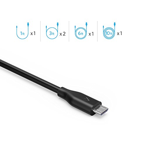 [Description] The Anker Advantage: Join the 10 million+ powered by our leading technology. Lasts 10x Longer: Reinforced stress points with a 5000+ bend lifespan make PowerLine many times more durable than anything else on the market. Faster Charging: Thick gauge wiring and reduced cable resistance enable PowerLine to provide the fastest possible charge via any USB charger_ plus high-speed data transfer. Great Lengths: One 1ft_ two 3ft (including plugs)_ one 6ft and one 10ft cables offer a length ready for every situation. What You Get: 5 Anker PowerLine Micro USB cables in assorted lengths_ our worry-free 18-month warranty and friendly customer service.