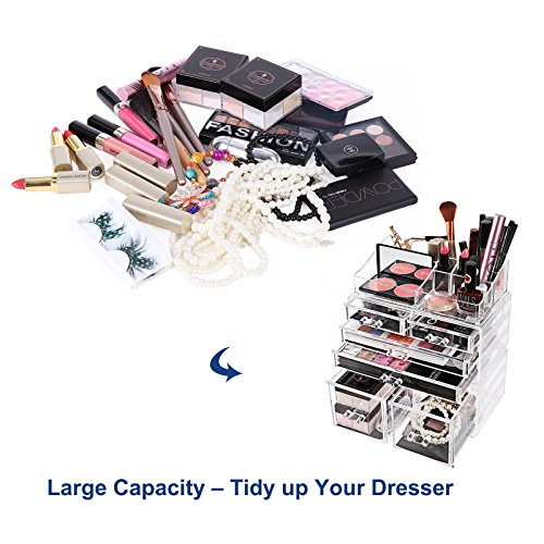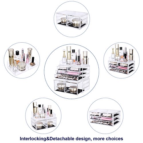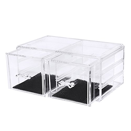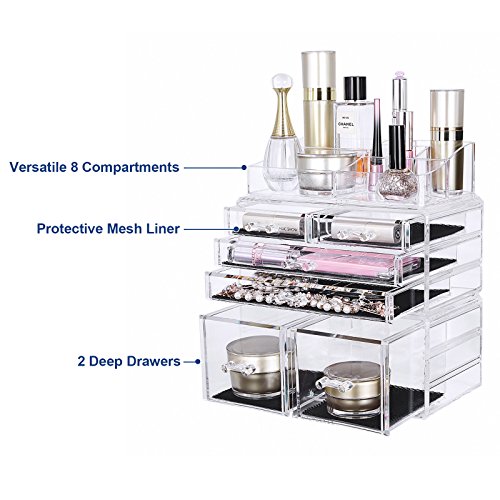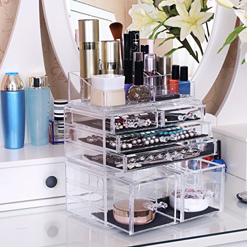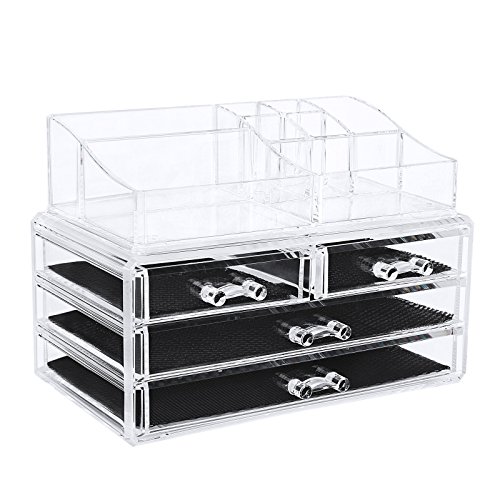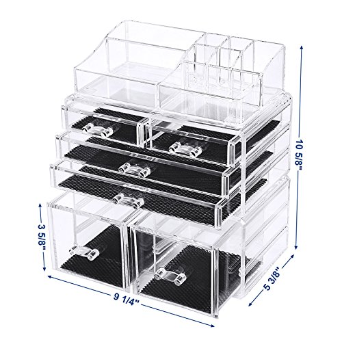 Studio : Songmics Publisher : Songmics Binding : Kitchen Product Description SONGMICS clear makeup holder organizer, a great addition to bedroom vanity, bathroom counter and office desk, helps you store and easily find cosmetic items, makeup products, office supplies etc. Features 6 drawers, 4 compartments of various sizes and 4 lipstick slots to keep dressers neat and free of clutter. The cosmetic jewelry storage organizer elegantly displays your paletts, eyeliners, makeup brushes, lip glosses, jewelry and other accessories. Definitely a must-have for daily makeup! Specifications: - Material: PS - Color: Crystal-clear - Product Size: 9 1/4"L x 5 1/2"D x 10 7/8"H (23.5 x 14 x 27.5cm) - Product Weight: 4.51lbs (2.05kg) - Ready to Use: Yes Package Contents: - 1 x Makeup Organizer(3 Pieces) Notes: - Please protect your makeup organizer from sharp objects to avoid scratches. - Please avoid collisions and falling off when use. 0