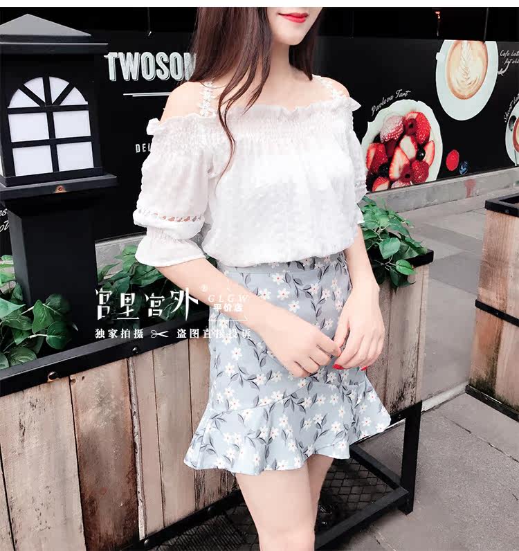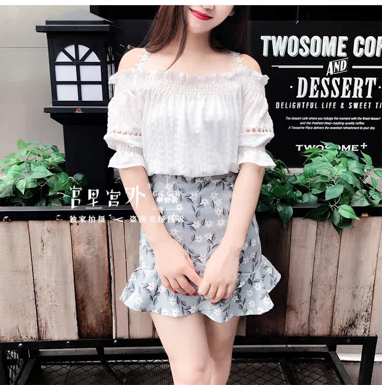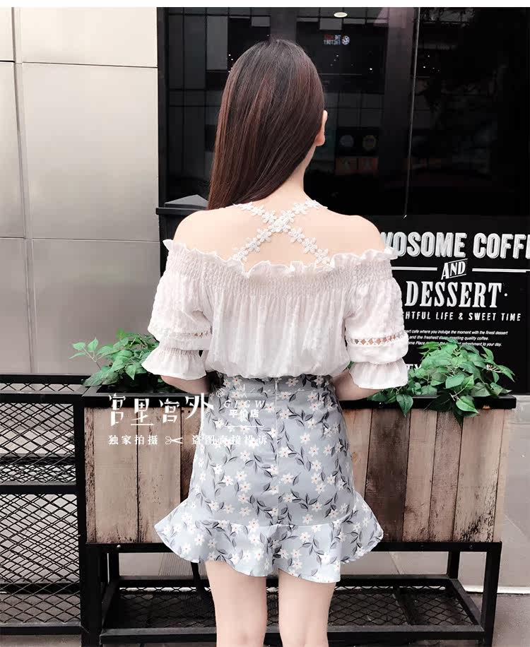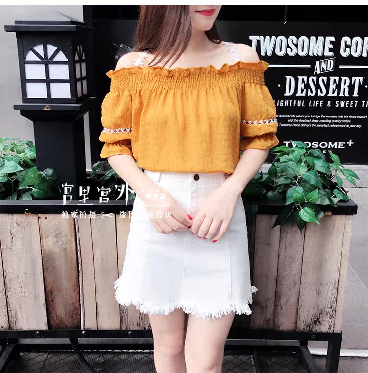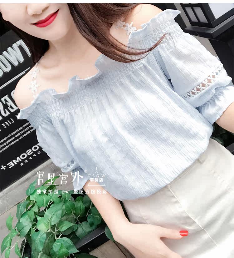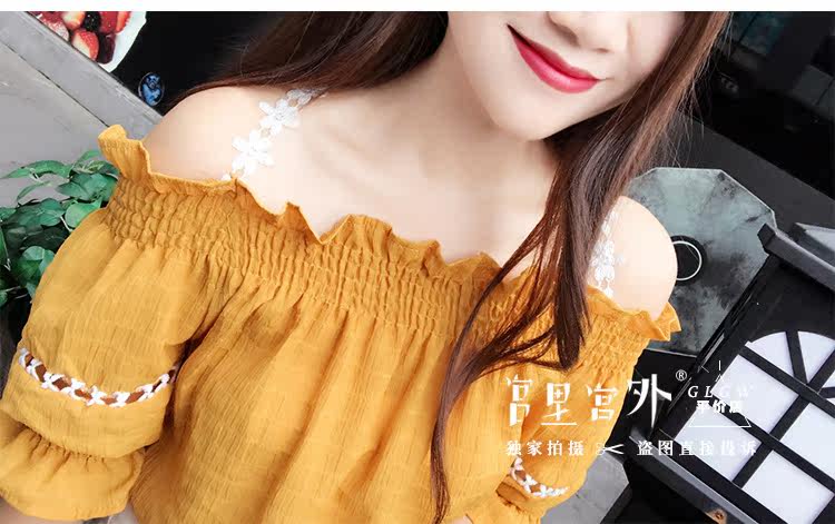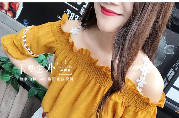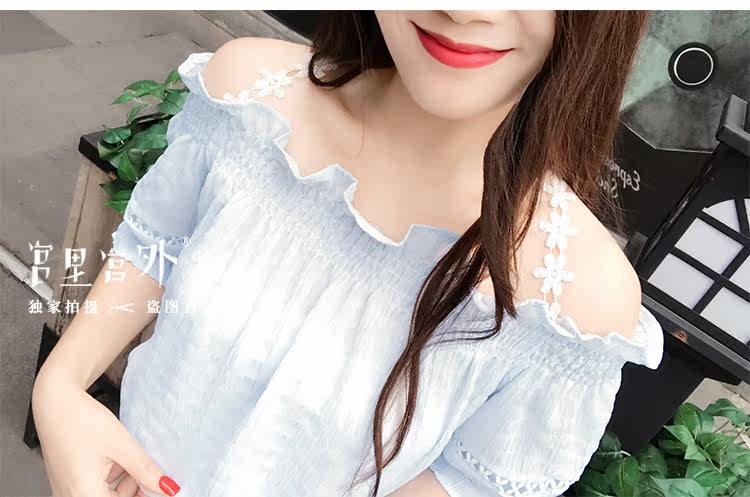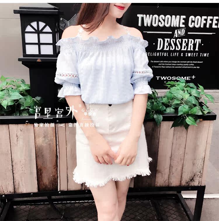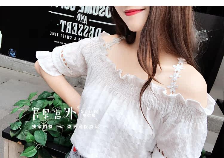 夏季新款女装甜美木耳边吊带露肩雪纺衫一字肩上衣 短袖 韩国