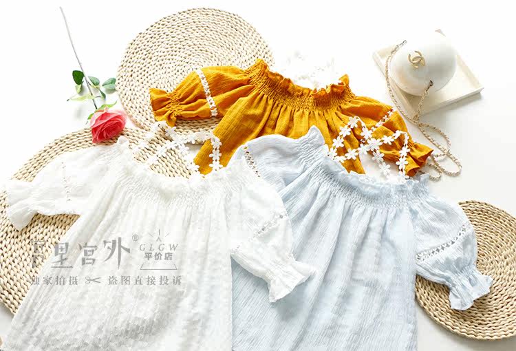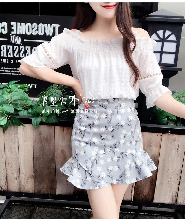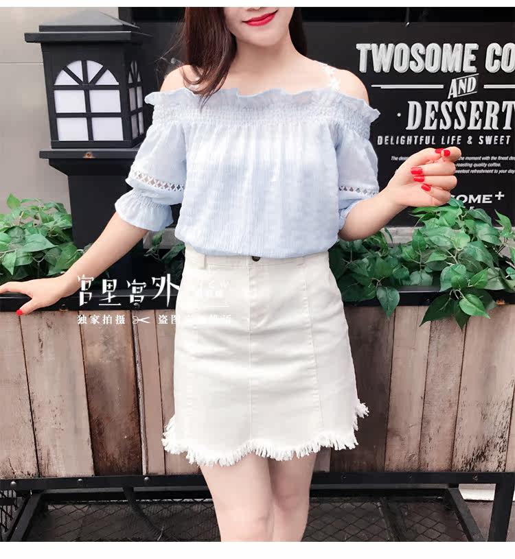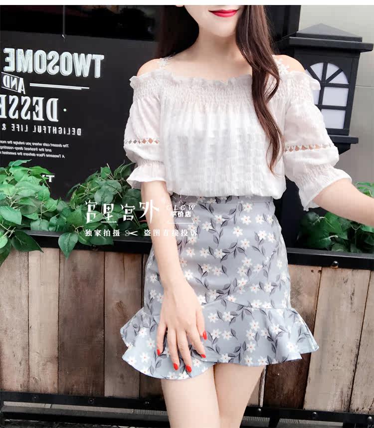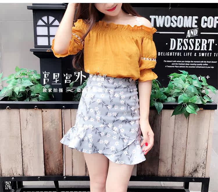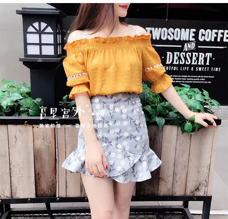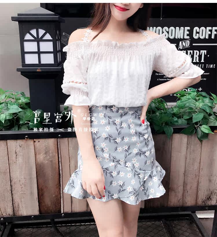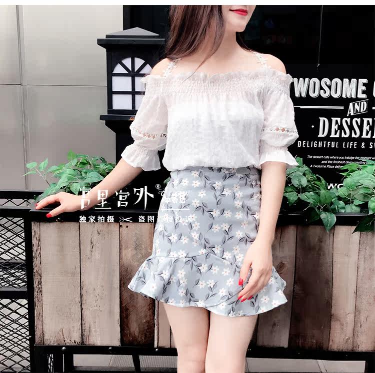 夏季新款女装甜美木耳边吊带露肩雪纺衫一字肩上衣 短袖 韩国