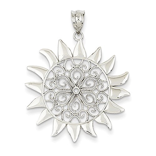 Solar fun, this flaming sun pendant features a textured filigree and polished ray design fashioned from14k white gold. It is approximately 27mm (1 1/16 inch) in width by 34mm (1 5/16 Inch) in length, which includes the tapered bail. Made in the U.S.A. Chain not includedFeature