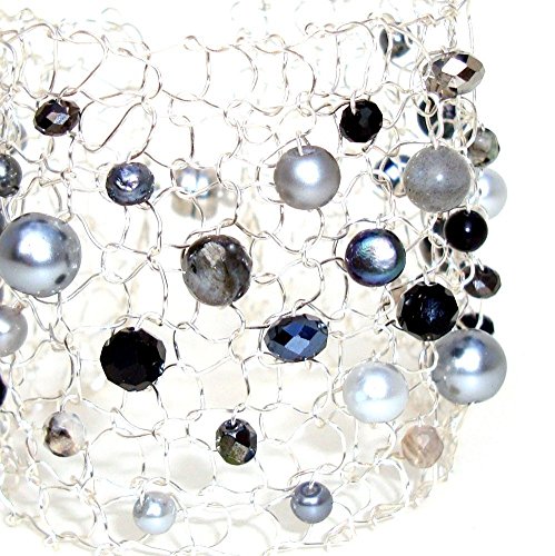-. Title : Labradorite Silver Cuff Bracelet Semiprecious Stone Beaded Arm Cuff Original Lapisbeach Wide Silver Bracelet in Grey and Black