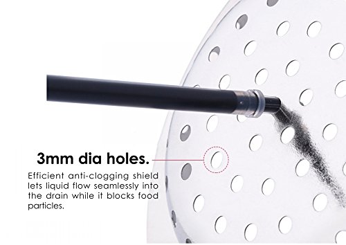 OUTSTANDING FUNCTION - 3mm dia holes. Efficient anti-clogging shield lets liquid flow seamlessly into the drain while it blocks food particles.