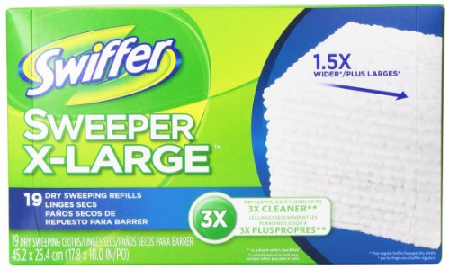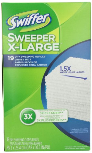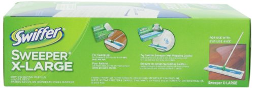 ReleaseDate : 2013-08-05 Studio : Procter Gamble Home Care Publisher : Procter Gamble Home Care Binding : Health and Beauty Product Description The Swiffer Sweeper X-Large cloths are 1.5x wider than regular Swiffer Sweeper. Pick up more dirt, dust and hair with each swipe. Using thick dirt-grabbing ridges and grooves, our powerful dry sweeping cloths leave your floors cleaner than a broom, even on textured surfaces. *Do not use Swiffer Sweeper wet mopping cloths on unfinished, oiled, or waxed wooden boards, non-sealed tiles or carpeted floors 0