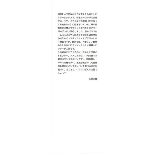 【商品説明】 定価(税込み):1,404円 値引き:10% OFF 植物を刈り込んで、さまざまな形をつくるトピアリー。トピアリーづくりはジャンボ一家の大切な収入源です。ところが感謝祭用につくった七面鳥のトピアリーが盗まれてしまい……。ジャンボ一家が力を合せて事件を解決します! バーゲンブック 新品 特価 格安 子ども ドリル 中学年向読み物 絵本 えほん 中学年 読み物 植物 |