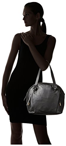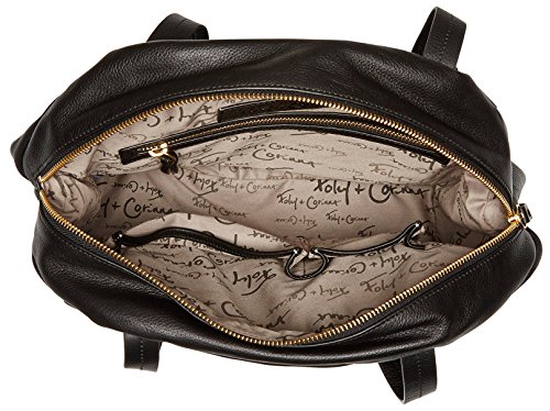 Chic top handle design features supple leather construction, 1 zip, 2 slip interior pockets; 2 exterior zip pockets