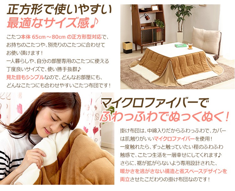 【商品について】マイクロファイバー使用!省スペースこたつ布団【幅65-80cm・正方形こたつ対応】(こたつ布団単品)■サイズ:外寸:(約)175x175cm※商品重量:(約)1.7kg■カラー:ベージュ ブラウン■素材:側生地(表地・裏地・詰め物):ポリエステル100% ※洗濯可能(ネット使用)■その他:・完成品でのお届けです。(お届け時は圧縮された状態で届きます)・梱包サイズ:(約)45x45x18cm・梱包重量:(約)2.7kg