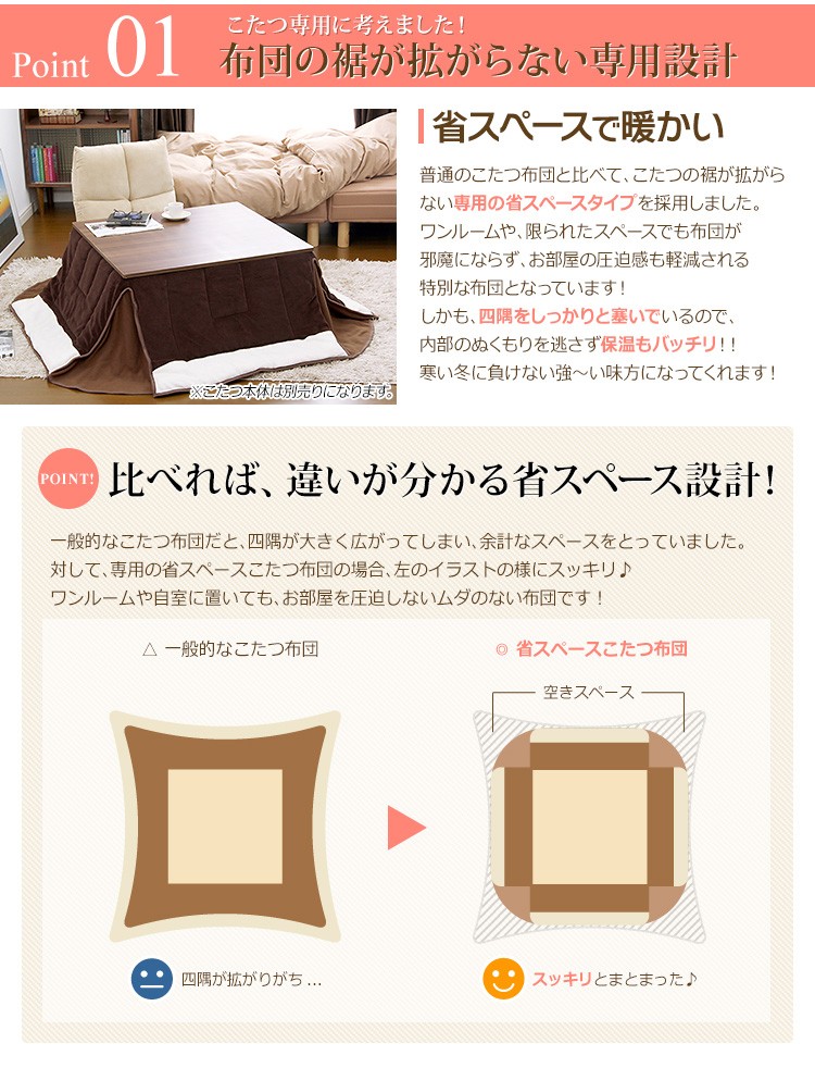 こたつ専用布団(ブラウン/ベージュ)単品【正方形タイプ】(65~80cm幅対応) ![]() こたつ専用布団(ブラウン/ベージュ)単品【丸型タイプ】(直径75~85cm対応)はこちら ![]() こたつ専用布団(ピンク)単品【正方形タイプ】(65~80cm幅対応)はこちら ![]() |