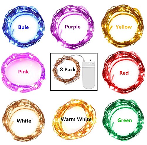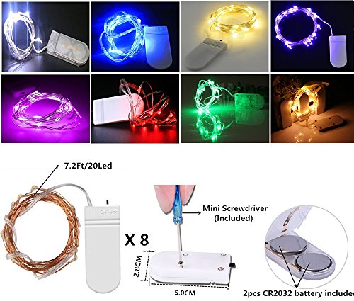 -. Feature : Specifications: Pack of 8 Units,7.2ft 20LED/each,LED Color: Warm White,White,Bule,Pink,Purple,Yellow,Red and Green. / Easy Operation:offer 48 hours lighting, 2pcs CR2032 batteries(included) can be replaced easily with screwdriver(Included) / Wide Application: Decorations Party Babyroom Wedding Dinner Table Halloween Christmas Tree / Portable: Mini size, easily carry and place the lights anywhere you like. / Waterproof:Only the copper color wire part is waterproof, not included the battery box.