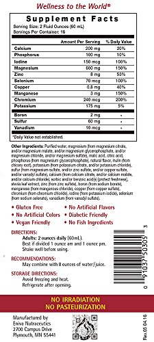 proprietary delivery system yields an advanced aqueous form of mineral ions (Solutomic) in sparkling clear solution for quicker absorption than tablets or capsules which must first dissolve in the digestive system before being absorbed.The natural fruit flavors offer a light citrus and refreshing taste.It has been clinically stated and supported by leading medical researchers that every adult should take a daily multiple supplement and whole food vitamins. Eniva Cell-Ready Multi Minerals Natural Flavors provide a complete and appropriate physiologic balance of minerals to meet this recommendation and provide a foundation for healthy living.* Cell-Ready Minerals utilize Enivas proprietary Solutomic technology to provide advanced aqueous mineral nutrition, making it one of the best liquid vitamins on the market today.*Solutomic: An advanced form of mineral ions in solution for enhanced absorption and body use. Aqueous Stabilization:Eniva's liquid proprietary nutrient stabilization process.Scientific References:Data on file, Eniva Corporation, 2016. Ingredients: Purified water, magnesium (from magnesium citrate, and/or magnesium malate, and/or magnesium glycerophosphate, and/or magnesium chloride, and/or magnesium sulfate), malic acid, citric acid, phosphorus (from magnesium glycerophosphate), natural flavor, inulin (from chicory root), potassium (from potassium citrate, and/or potassium chloride), sulfur (from magnesium sulfate, and/or zinc sulfate, and/or copper sulfate, and/or vanadyl sulfate), calcium (from calcium citrate, and/or calcium malate, and/or calcium chloride), sorbic and/or benzoic acid(s) [protect freshness], stevia leaf extract, zinc (from zinc sulfate), boron (from sodium borate), manganese (from manganous chloride), copper (from copper sulfate), chromium (from chromium chloride), iodine (from potassium iodide), selenium (from sodium selenate), vanadium (from vanadyl sulfate).Feature