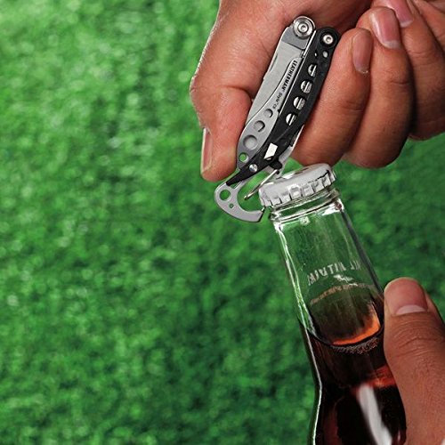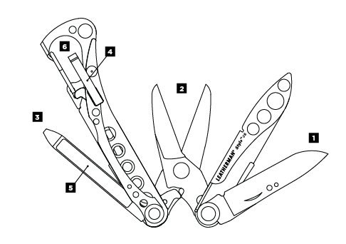 FEATURING 6 TOOLS: 420HC Knife, Spring-action Scissors, Flat/Phillips Screwdriver, Tweezers, Nail File, Carabiner/Bottle Opener.