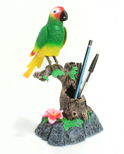 The Talking Parrot repeats whatever you say! Ever wanted a parrot as a pet? Well, here's your chance. Enjoy the back and forth banter with a toy parrot that repeats what you say twice. Get within effective recording range (3 feet) and the Sound Sensor Technology starts recording at the sound of your voice. Once the hidden mic starts recording, the base will light up. Aside from the repeated words, the animated parrot also spews out random words and phrases such as "hello", "I see you", and "I love you". It also whistles and tweets without warning, and don't be surprised when it moves from side to side, opens its beak, and flaps its wings. Use the on/off switch and have a friendly conversation at a moment's notice. Sit the animated toy on a desktop and take advantage of the pen holder. electronic pet bird - novelty decor - voice recording toy - talking parrot toy - novelty itemFeature