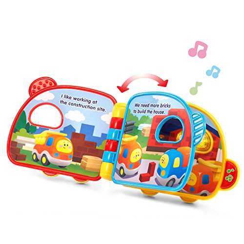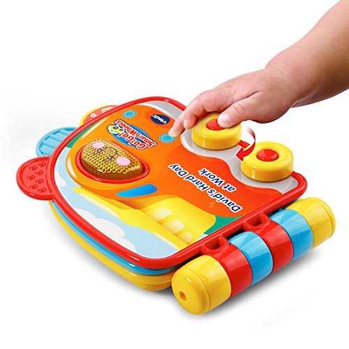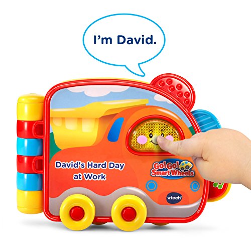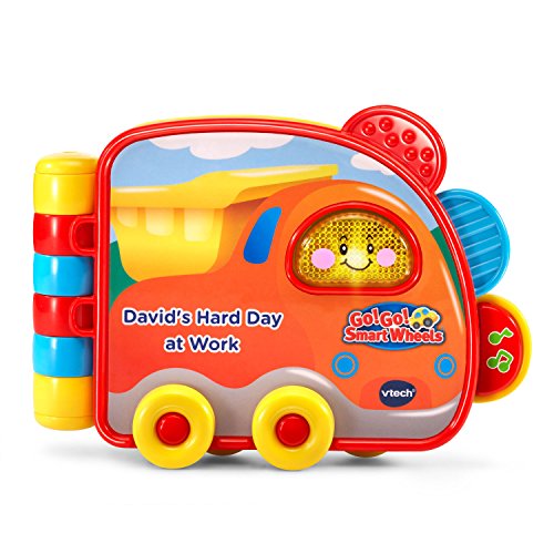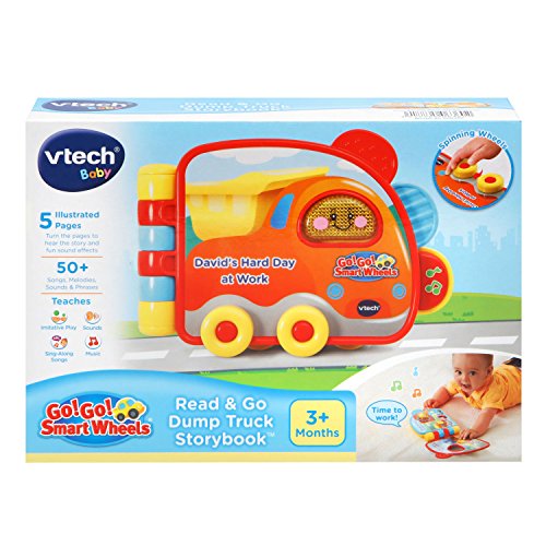 Join David for an exciting day of adventures! Your little one can read or listen to the story David's Hard Day at Work in the Go! Go! Smart Wheels® Read & Go Dump Truck StorybookTM by VTech®. The five illustrated pages play realistic sounds and role-play phrases. Colorful, chunky tabs make it easy to turn the pages. Press the light-up face button to hear songs and fun responses. Press the music button to hear 15 different classic melodies. While a melody is playing, press the light-up face button to add fun sounds. Wheels on the bottom of the book spin for added play. Product Dimensions: 7.7 x 5.5 x 1.8 inchesFeature