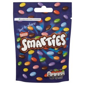 -. Binding : Grocery -. Brand : Chocolate Smarties Pouch Nestlé -. EAN : 7613035412262 -. Feature : Colourful milk chocolate sweets in a crisp sugar shell -. IsAdultProduct : 0 -. Label : Love to Share! Smarties Chocolate Smarties Pouch 125g -. LegalDisclaimer : THIS PRODUCT IS ONLY AVAILABLE FROM EUROPE AND MUST BE DISPATCHED FROM THERE. DUE TO THE NATURE OF THE SEASONAL CLIMATE AND THE DELIVERY COMPANIES USED, THE SELLER CANNOT BE RESPONSIBLE FOR ANY PRODUCT MELTED IN TRANSIT. PLEASE BE AWARE OF THIS PRIOR TO ORDERING. -. Manufacturer : Love to Share! Smarties Chocolate Smarties Pouch 125g -. Model : 107944837 -. PackageQuantity : 1 -. ProductGroup : Grocery -. ProductTypeName : GROCERY -. Publisher : Love to Share! Smarties Chocolate Smarties Pouch 125g -. Studio : Love to Share! Smarties Chocolate Smarties Pouch 125g -. Title : Original Smarties Pouch Bag Love to Share! Smarties Chocolate Smarties Pouch 125g- Imported from the UK England