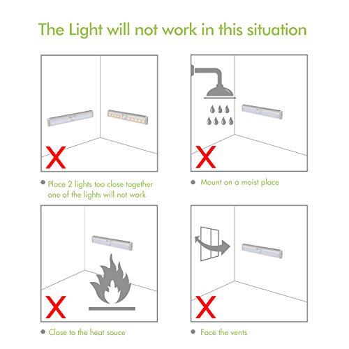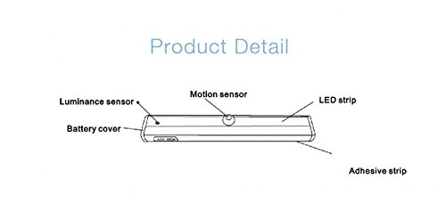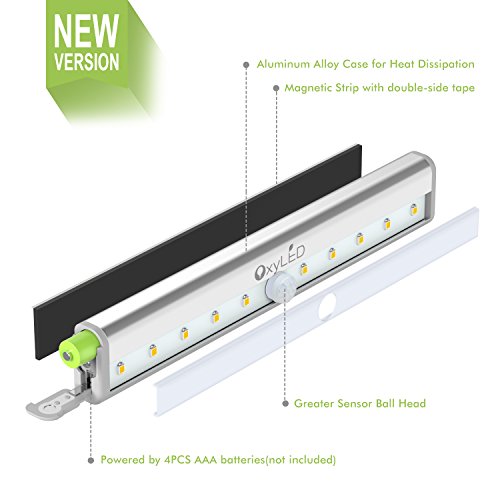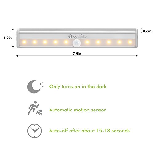 Studio : OxyLED Publisher : OxyLED Product Description OxyLED Motion Sensor Closet Light,Show Seiko quality, Taste home fun. With OxyLED Motion Sensor Lights, you can... - Say good bye to bumping into stuff in the dark. - Comfort kids who are afraid of the dark. - Cheaper to run than ceiling lights. Automatic Sensor: Auto-on within 10 feet, auto-off after 15-18 seconds of no motion detected. With easy installation, it mounts in seconds. No hammers, drills, or tools required. An adhesive strip with magnetic fields is easily attached to and detachable from the lamp body. Specifications: 1.Sensitivity > 3 meter Distance 2.Sensor Range: 120 degrees 3.LED Qty: 10 LED 4.Light color: Pure White 5.LED life: 50,000 hours or more 6.Size: 7.5 x 1.2 in (L x W) 7.Material: Aluminum ABS 8.Light weight: 114g / 4.0oz Tips: ▲Please kindly check if the batteries have been installed in the correct direction. There is an instruction label to prompt you this information. ▲Please do not install 2 lights too close from each other. The lighting may cause the other one DOES NOT work. ▲This light can only be turned on in darkness environment. ▲Battery Not Included. Package Content: - 1 x 10 LED IR Sensor Closet light - 1 x User Manual - 1 Year Replacement Warranty, 30 Days Money Back Guarantee 0