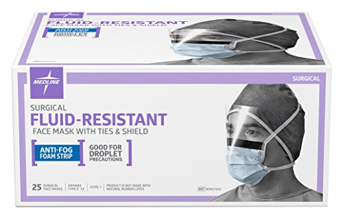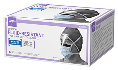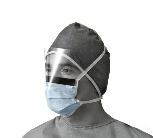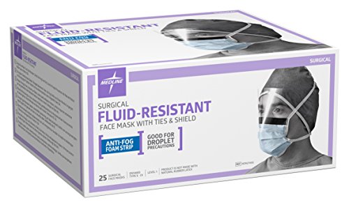 Medline NON27405 Prohibit X-Tra Fluid Protection Surgical Face Mask with Eyeshield, Anit-Fog, Cellulose, Latex Free, Blue (Pack of 100)
