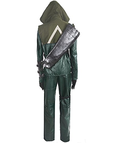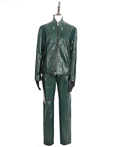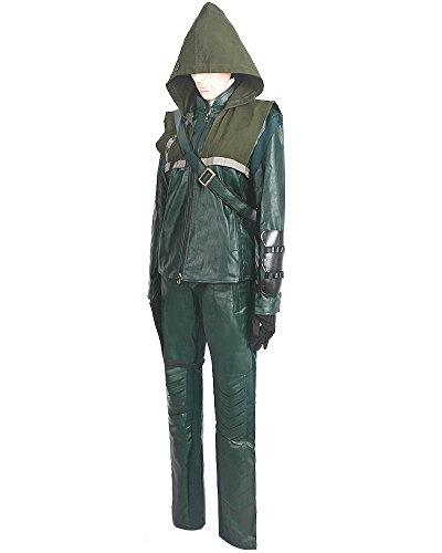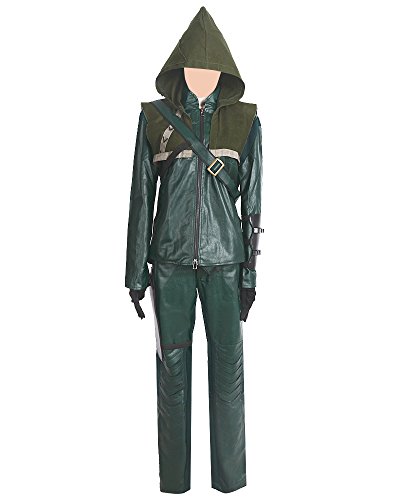 -. Brand : Miccostumes -. Color : Green -. Department : Mens -. Feature : The main part of the outfit is made of pu leather.It comes with a green pu jacket with black lining,a pair of green pu pants,a detachable olive canvas hoody with shouler holes,a black arrow sheath with a shoulder strap, a wrist guard for left hand,a green pu belt,a thigh guard and a pair of black gloves. / The pants feature a zipper and a button to finish in front.Two pockets finished by zippers are added at each side of the pants. / The part from knee to mid-calf of each leg is designed with pu arrow patch. / The jacket is finished with a zipper.The cuffs and the back of the jacket are sewed with green lines which resemble the arrow. / The detachable hoody and two sides of the front zipper on the jacket are both designed with velcros. -. PackageQuantity : 1 -. ProductGroup : Apparel -. ProductTypeName : ADULT_COSTUME -. Title : Miccostumes Men's Arrow Fighter Cosplay Costume Green