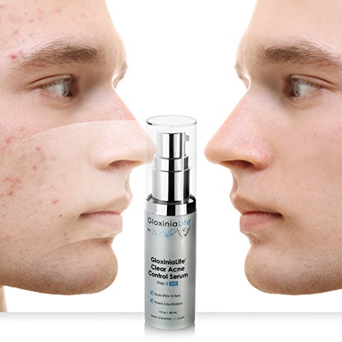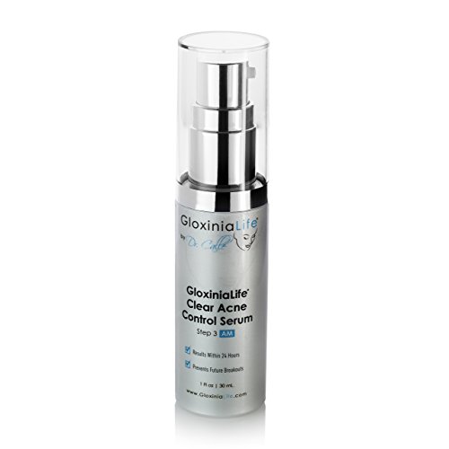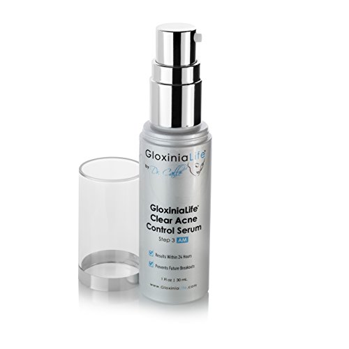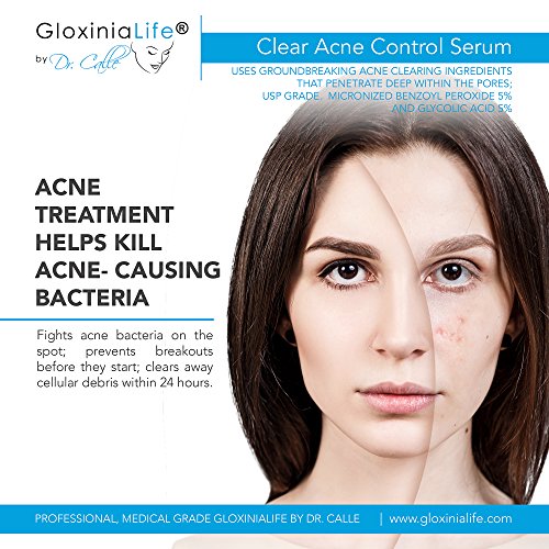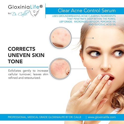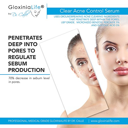 PROFESSIONAL, MEDICAL GRADE GLOXINIALIFE BY DR. CALLE CLEAR ACNE CONTROL SERUM; uses groundbreaking acne clearing ingredients that penetrate deep within the pores; USP Grade Micronized Benzoyl Peroxide 5% and Glycolic Acid 5%
