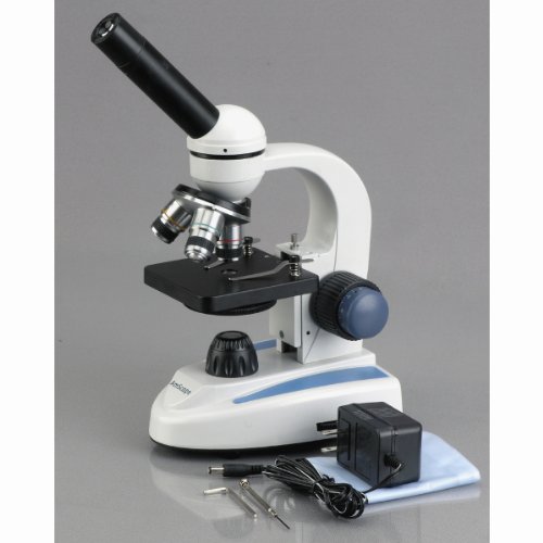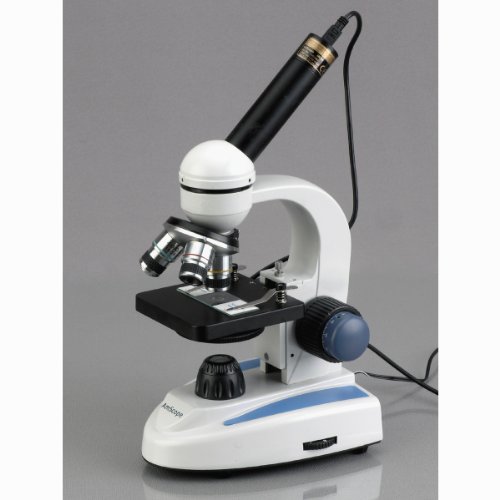 AmScope M158C-E Compound Monocular Microscope, WF10x and WF25x Eyepieces, 40x-1000x Magnification, Brightfield, LED Illumination, Plain Stage, 110V, Includes 0.3MP Camera and Software