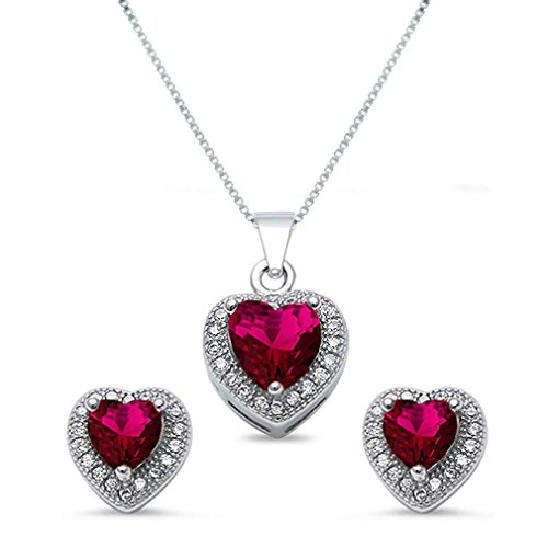 -. Title : Sterling Silver Heart Shaped Simulated Ruby Necklace and Earrings Set