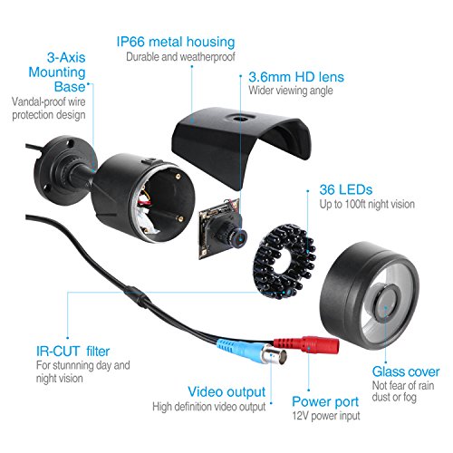 -. Feature : 720P/1.0MP High Definition: High performance lens captures everything in great detail and presents true-to-life color on screen. Requires BNC video and 2.1mm DC power cable (not included, available separately) / Around-the-Clock Protection: Smart IR-Cut filter for best image reproduction,up to 66ft/20m clear B&W night vision / IP66 Weatherproof:Dustproof and waterproof, suitable for both indoor and outdoor use. / Easy Installing Three-Axis Bracket: Designed for easy installation, adjust the camera mounting angle with ease. / Works perfectly with 720P/1080N/1080p AHD DVR systems.