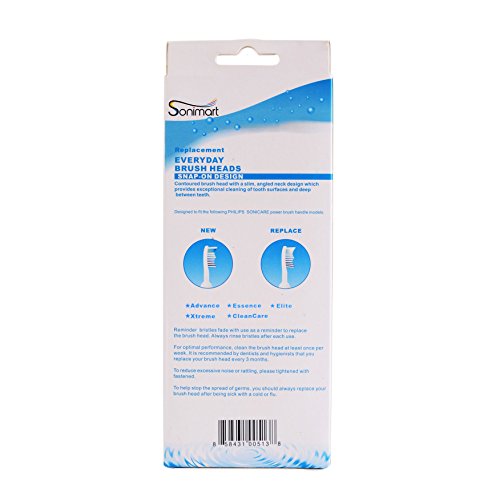 - Feature : Sonimart compact toothbrush heads are designed for small mouth and feature a power-reach tip to help clean in hard-to-reach places / Screw-on system fits: Advance, CleanCare, Elite, Essence and Xtreme Philips Brush Handles / The quality of Sonimart Premium toothbrush heads is the MOST comparable to Philips Sonicare / OEHHA Prop 65 approved Sonimart toothbrush heads are made at the highest health and safety standard / Reminder bristles will fade when a replacement is needed, usually three months