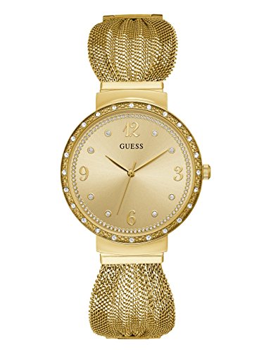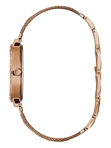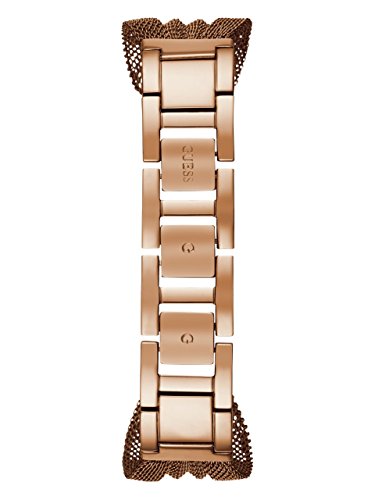 Watch Sizing Guide Find a luxe pairing to your dressy attire with this Guess® watch. Stainless steel case. Ruffled mesh bracelet with jewelry clasp closure. Round face. Three-hand analog display with quartz movement. Dial features rose gold-tone hands and hour markers, glittered accenting, and Guess detailing. Crystal-embellished bezel. Water resistant up to 3 ATM. Display case included. Imported. Guess Watch Warranty Measurements: Case Height: 36 mm Case Width: 36 mm Case Depth: 9 mm Band Width: 3⁄5 mm Band Circumference/Length: 9 in Weight: 2 oz This product may have a manufacturer's warranty. Please visit the manufacturer's website or contact us at warranty@support.zappos.com for full manufacturer warranty details.Feature