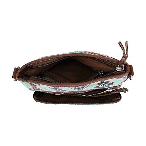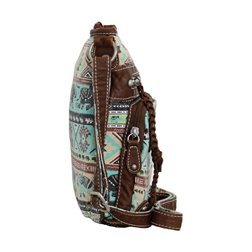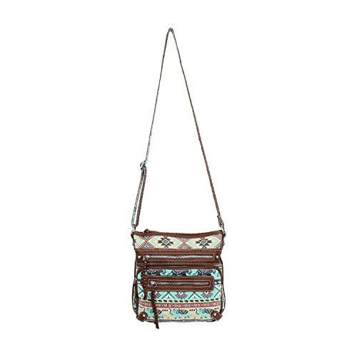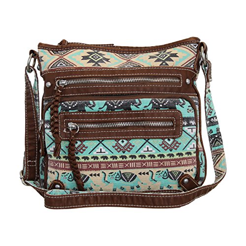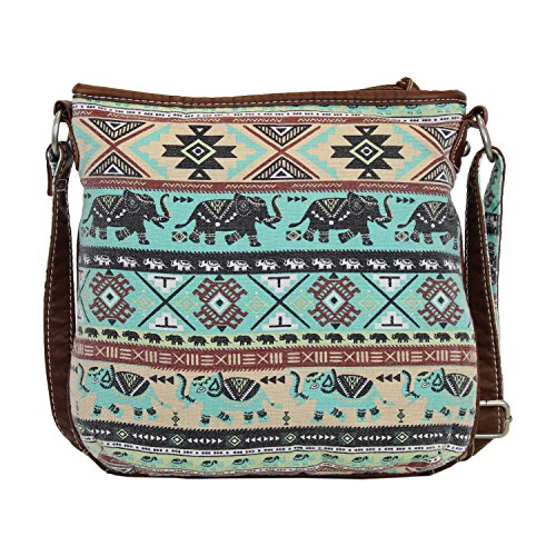 Mid-sized, fully lined roomy cotton bag has soft, faux leather trim accented with brass hardware. Inside there are two slip top pockets and one zippered pocket. The bag has a full zippered top to keep your valuables secure and there are three zippered pockets on the outside front. These are perfect for those items you want to access quickly, like keys, mints, phone etc. Measures about 9 ½ inches by 9 ½ inches with a 50 inch strap that can be shortened for use as a shoulder bag, it's the perfect size for everyday, hands-free use. The bag fabric sports rows of elephants with upturned trunks (for Good Luck!) alternating with rows of Aztec/Tribal/Native designs. Design placement may vary slightly from the photo. Available for a limited time only, this boho chic bag makes a great gift!Feature