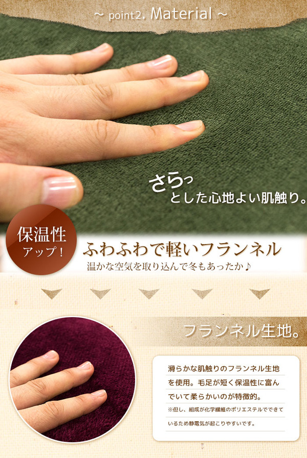 注意点:組成が化学繊維のポリエステルを多く占めているため静電気が発生しやすい仕様となっております。