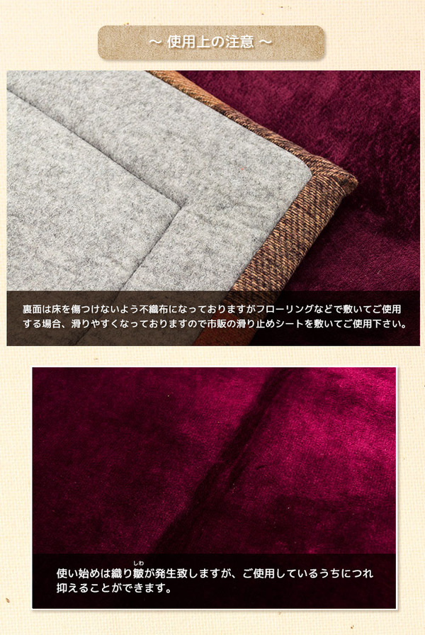 組成:表地/ポリエステル100%、額部分/ポリエステル60%、アクリル25%、レーヨン4%、その他11%、中材/8-10mmウレタンフォーム、裏地/ポリエステル100%(不織布)
