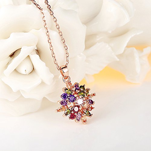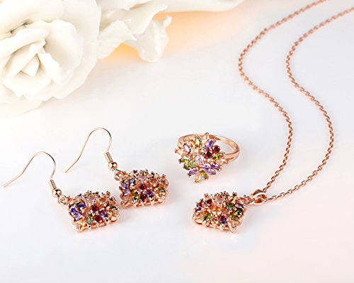 -. Feature : Material:18K Rose Gold Plated Brass+ MultiColor AAA CZ / Earring Size: 1.5in*0.8in, Necklace chain size: 17in+2in, Pendant size:0.8in, Ring size: Size 6,7,8,9 / Beautiful sets with sparkling stones in gorgeous rose gold settings ,nice and shiny flower design cubic zirconia that keeps everyone's eyes on you / Suitable for any occasion, easy to match with clothes, perfect jewelry to expand a woman's fashion wardrobe with a timeless, classic style / Well packed in a fine box.Great gift for girlfriend or families, or best friends on Christmas Day, Birthday, Valentines Day, Anniversary, Thanksgiving Day, etc. It will undoubtedly catch her heart