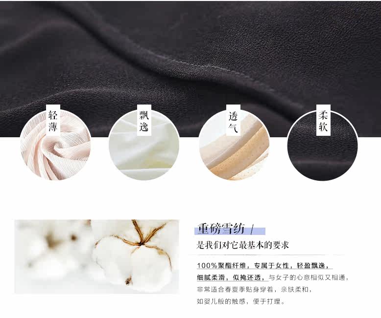 轻薄飘逸的雪纺材质,似掩还透,与女子的心意相似又相通。  雪纺材质