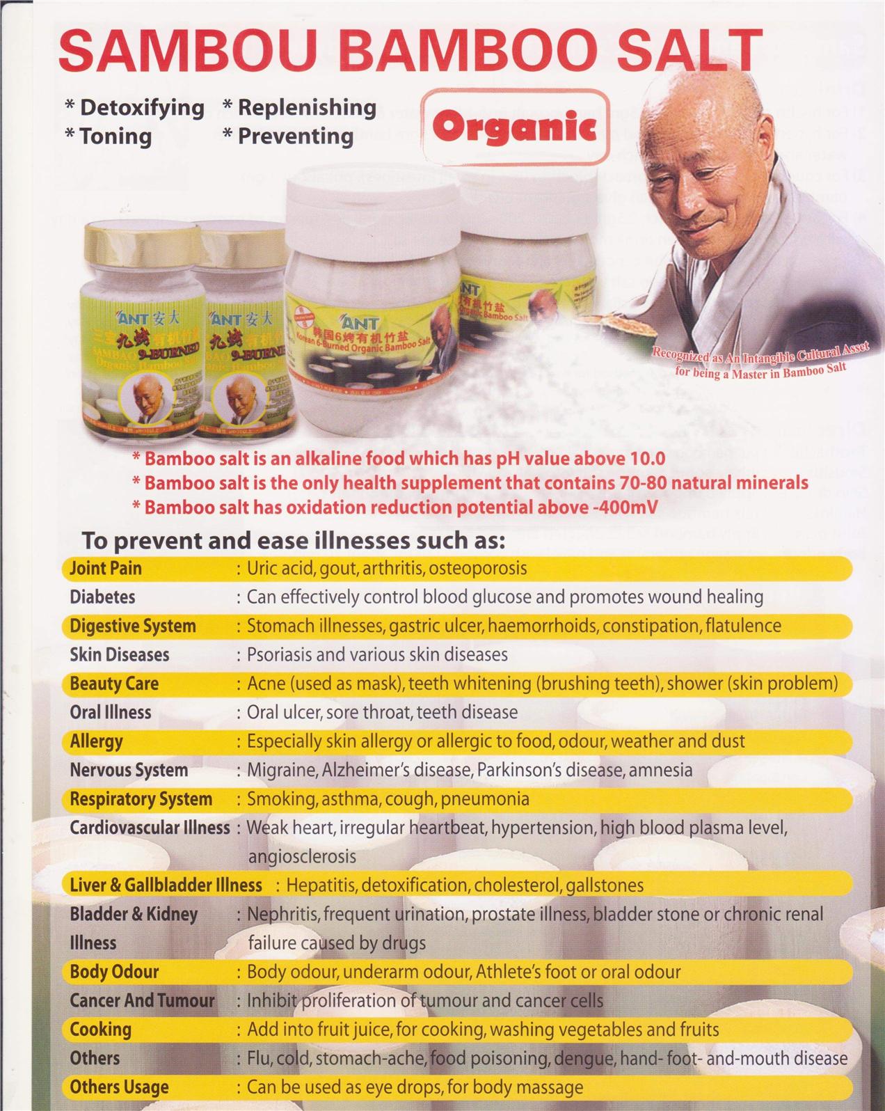 High oxidization resistance level ( ORP -200mV ) to detoxify polluted materials. It help to maintain the PH of our body, can neutralize the acidic toxin in our body rapidly such as uric, high blood sugar, high cholesterol etc. To improve the digestive system problem like gastropathy, gastric ulcer, intestinal disorder, hemorrhoids or constipation. For heart diseases, hypertension and kidney failure cases, be advised to take bamboo salt instead of chemical salt.