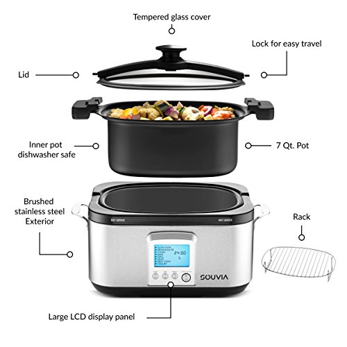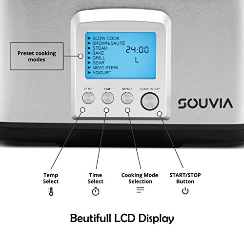 Souvia Multi Cooker all in one cooking pot makes meal preparation, baking and cooking a "piece of cake."No more slaving away over the hot stove or deep fat fryer when you can use one state of the art cooking machine for everything.
