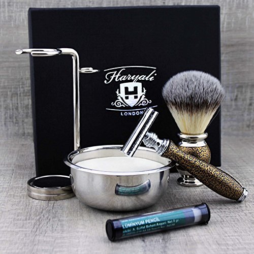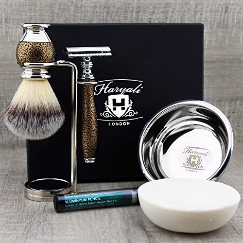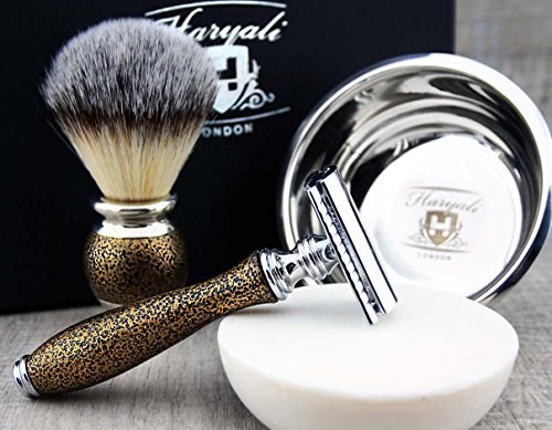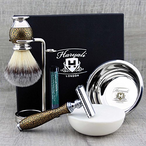 Classic Old-school Men's Shaving Set >Synthetic Brush, DE Safety (Blades NOT Included), Dual Stand, Engraved Bowl & Soap
