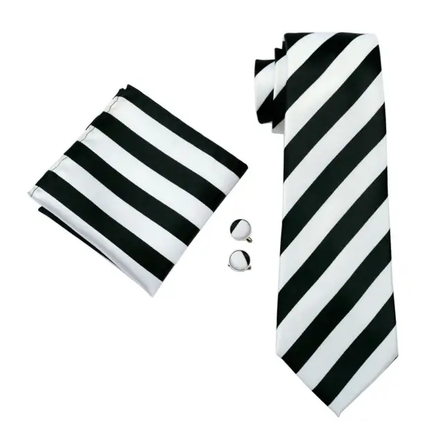 LS-276 뜨거운 남성 넥타이 화이트 블랙 스트라이프 100% 실크 자카드 짠 넥타이 손수건 커프스 세트 남성 정장 웨딩 파티 비즈니스