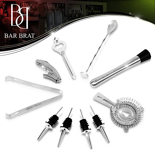 - ★ MAKE PRACTICALLY ANY DRINK WITH OUR COMPLETE BAR SET - As the trusted brand with many bar products, Bar Brat provides is a complete bundle set - Includes 2 double sided jigger, strainer, 2 cocktail mixing shaker, corkscrew, ice tongs, wine opener, and 4 bar pourers.