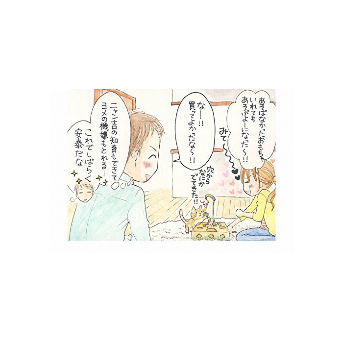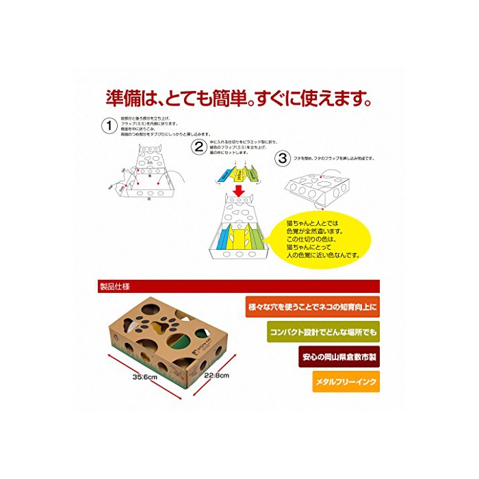 여러가지 형태의 구멍에서 꺼내는 것으로 고양이의 지육에 도움이 됩니다.상자의 중의 결산의 청색,노란색,녹색이 고양이의색 가쿠에게 반응합니다.
