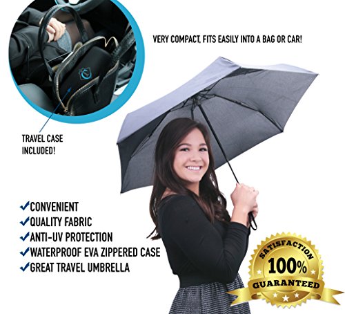 -. Feature : PROTECTION FROM THE ELEMENTS: This most stylish way to tackle the great outdoors, this sturdy travel umbrella is waterproof, windproof and even sunproof! / COMPACT & PORTABLE: The durable, super-lightweight umbrella fits neatly into your bag or coat pocket, so you'll never be caught in a shower without it! / QUICK DRYING DESIGN: Water resistant rain umbrella will keep you dry, and moisture wicking material will also dry fast when you're back under cover / WATERPROOF TRAVEL CAPSULE: Put your wet umbrella in your bag without soaking or damaging the contents, with the convenient water resistant travel case. / TOUGH & DURABLE: With sturdy construction and durable, sunproof UV coating, this stylish, foldable umbrella is operated with a simple button at the base of the handle