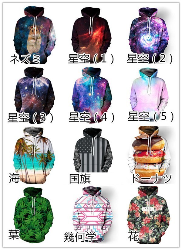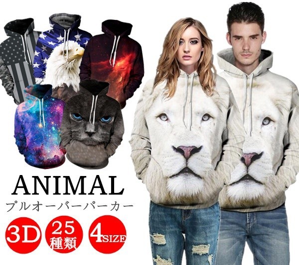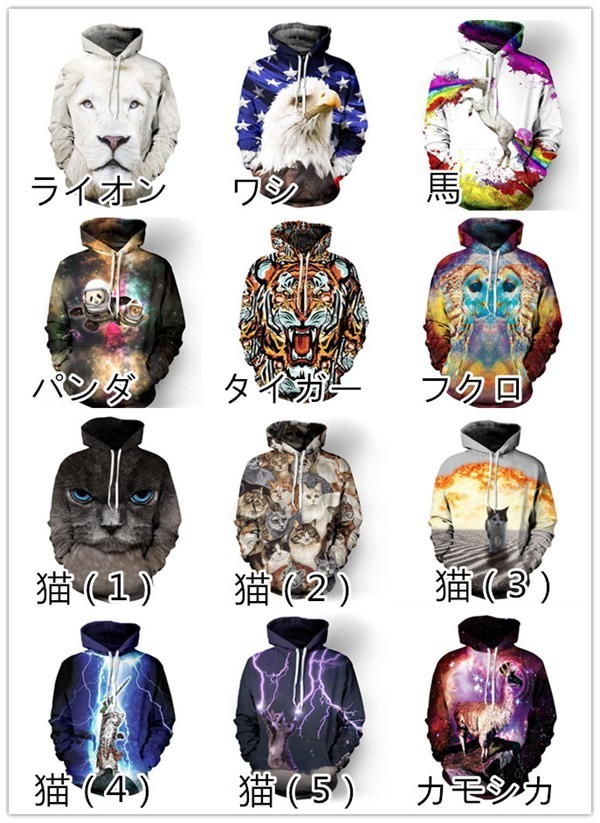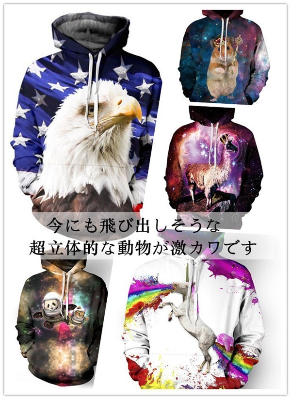 【サイズ】S M L XL S/Mサイズ 約112×69×63×47cm(胸囲×身丈×袖丈×肩幅) L/XLサイズ 約114×71×64×48cm(胸囲×身丈×袖丈×肩幅)【素 材】コットン、ポリエステル【カラー】ライオン、ワシ、馬、パンダ、タイガー、フクロ、猫(1)、猫(2)、猫(3)、猫(4)、猫(5)、 カモシカ、ネズミ、星空(1)、星空(2)、星空(3)、星空(4)、星空(5)、海、国旗、ドーナツ、 葉、幾何柄、花、ゲーム機【POINT!】◆25種類のデザイン、4種類のサイズから自分好みに選べる、プルオーバーパーカー!◆お誕生日プレゼント?ギフト?贈り物にも!◆「とびだせ! 動物 3D Tシャツ」の登場です!!!!◆今にも飛び出しそうな超立体的な動物が激カワです美しい瞳に一目惚れ!動物と目が合うとつい微笑んでしまいます。◆海外の若者の中でも大流行のトレンドファッション?豊富な種類であなた好みの動物を飼いましょう【ご注意】※1-3cm誤差可能性あります※プリントは若干のスレや色落ちがある場合がございます。