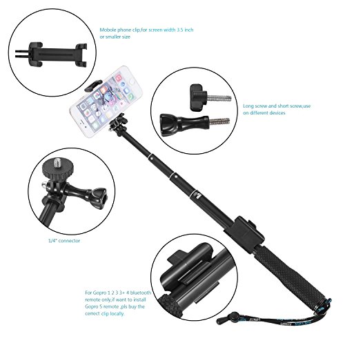 ★Applicable to a variety of devices:Compatible with GoPro Hero 1, Hero 2, Hero 3, Hero 3+,Hero 4 and Hero 5 cameras, YI Camera, SLR Camera, Mobile phone and Cell phone ,iPhone (iPhone 7/7s plus ,iPhone 7/7s,6s, iPhone 6, 6 Plus, iPhone 5, 5s, iPhone 4) and Smartphone up to 3.5" wide (Samsung Galaxy S6, S6 Edge, S5, S4, Galaxy Note, LG G4, LG G3 and so on.)