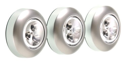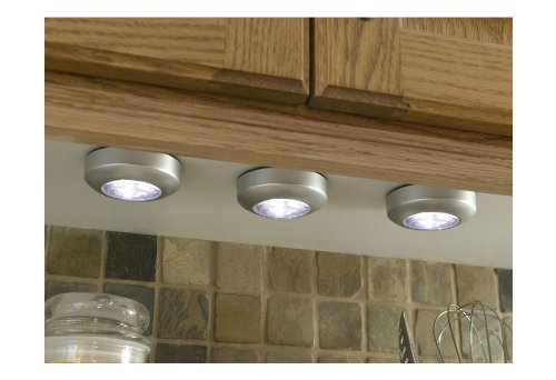Easily illuminate countertops, closets, pantries, storage shelves, stairways and other everyday spaces with this White Touch LED battery-operated tap lights. The round-shaped lights project a bright white beam of light and will outperform incandescent tap lights for longevity and brightness. Set of 6 battery operated stick on tap lights with convenient tap-on/off technology. Super-bright LEDs offer energy-efficient lighting and never need replacing. Operates for up to 100 hours on 3 AAA batteries (not included). Living Bright 14W-1232 White Touch LED Lights - Set of 6 is constructed with silver-toned ABS plastic construction; includes adhesive strips for easy installation. Each light measures 2-1/2 Inch in diameter by 1/2- inch deep.Feature