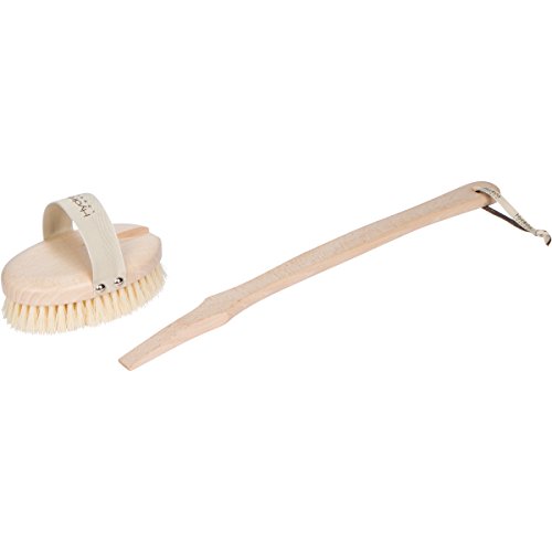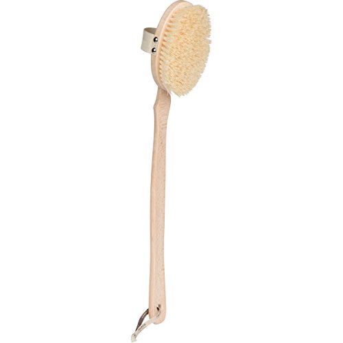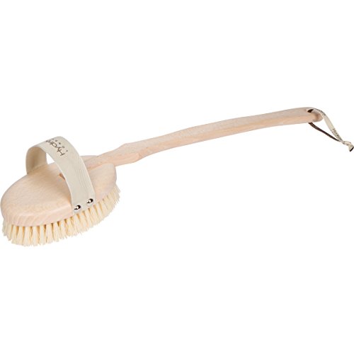 INTELLIGENTLY DESIGNED for easy at-home use and versatility. The brush head features a hand strap to prevent slips and drops, while the long beechwood handle boasts a subtle curve for optimal skin contact.