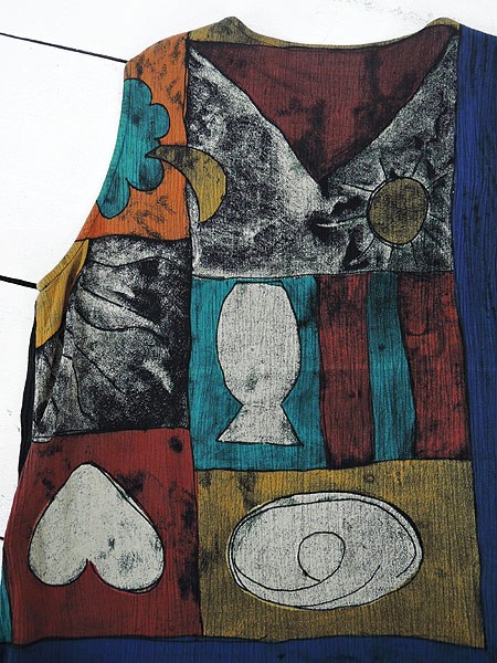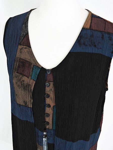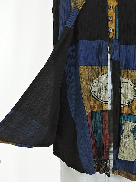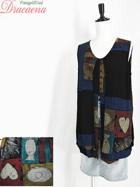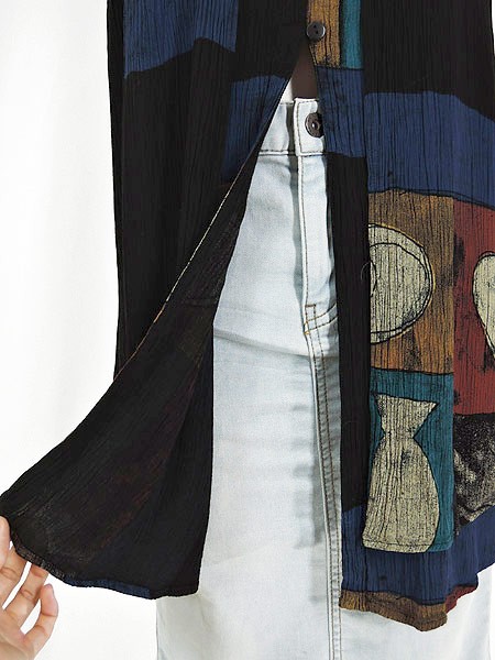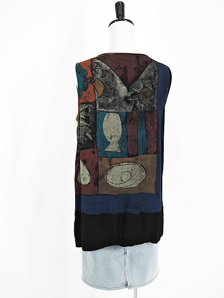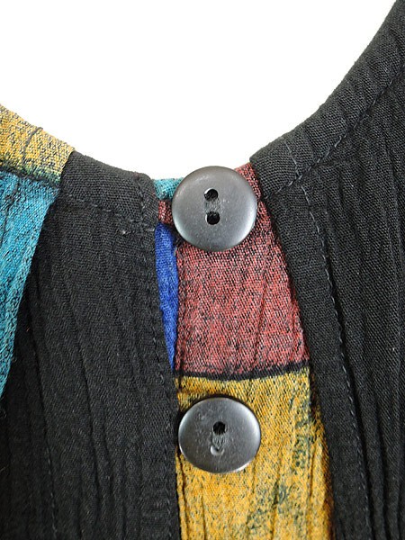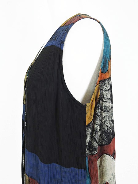 Ladies ブランド- カラー黒ベース メール便不可 コンディション★★★ 素材レーヨン 表記サイズM スタッフコメント後、中心付近、左脇付近に穴あきあり。 実寸サイズ 着丈 74・68 cm 身幅 47 cm 肩幅 34 cm ※ウエスト・ヒップ以外は平置き採寸