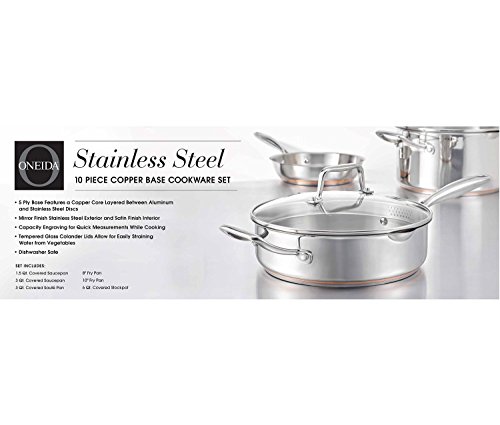 -. Feature : Oneida Copper Base 10pc set includes: 1.5qt covered saucepan, 3qt covered saucepan, 3qt covered saute pan, 8" fry pan, 10" fry pan, and 6qt covered stock pot / Each piece features a 5 ply base features a copper core layered between aluminum and stainless steel. Lids feature colander for easy straining and stainless steel cast riveted handles. / Cookware is 18/10 stainless steel vessels with brilliant mirror polish exterior / All pieces are induction ready with capacity engravings on saucepans, saute, and stockpot for quick measurements while cooking / Oven safe up to 350 degrees Fahrenheit. Set is dishwasher safe and has a lifetime warranty