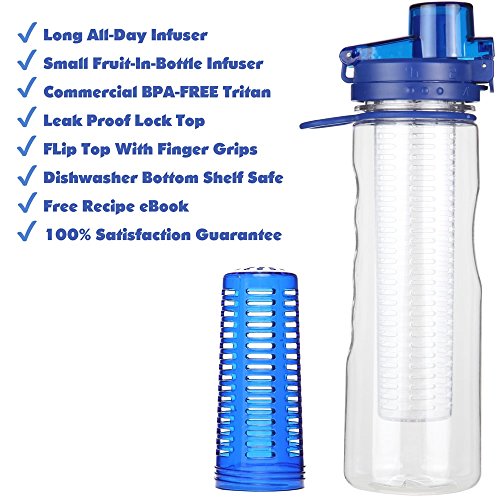 -. Feature : SAFE TO USE: Finger grips and a sports spout makes it fun to use while drinking in the car, exercising, at the office, outdoors, back to school, running, or the gym. You can also hang the strap on your belt or backpack. Built with durable Eastman Tritan, a clear BPA Free co-polyester, tested to be FDA safe for use with foods and beverages. / LEAK PROOF: Our locking lid ensures that not a single drop will leak like other infusers. The fruit-infuser flip top with reusable filter can be un-locked with one finger. Great for adults and kids - the cylinder is not too small and not too large. / EASY INFUSING: We find that a 1/2 filled sleeve will last for 2-3 infuse refills. Enough to meet your daily hydration needs. With the exclusive dual strainer and sleeve, you can put fruit on the outside of the diffuser for more fresh flavours. Add lemon, blueberry, cucumber, raspberry, watermelon, ginger, grapefruit, melon, strawberry or mint to your beverage infusions. We also will email you free water enhancer recipes (see product insert for details). / AVE MONEY: No need to buy expensive flavored bottled beverages. The Great Gear (TM) fruit-infused water bottle can be reused over and over! Easy to clean and dishwasher friendly. Easy to open certified FRUSTRATION FREE PACKAGING designed for low waste and minimum shipping expense. / OUR SATISFACTION GUARANTEED: We are so sure you will love your water bottle, we have a no-hassle 30-day satisfaction guarantee. You also get a Limited Lifetime Warranty, that includes accidental damage. (See product insert for warranty details.) Best teacher, stocking stuffer or premium holiday gift idea - your friends and family will love it - guaranteed of course.