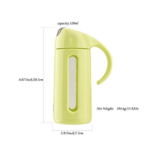 Diamter - 2.95inch/7.5cm Height - 8.07inch/20.5cm Item weight - 394.6g Capacity - 320ml/11oz Standard - BPA Free; FDA Approval Material - Glass ;PP plastic