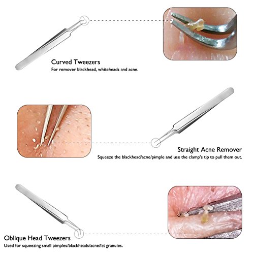 Useful Kit:6 * Blackhead remover needles and 3 * blackhead extractor tweezers and 2*Alcohol prep pad Blackhead remover kit can help to remove blackheads, acne and various blemishes.